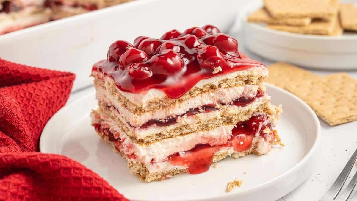 A no-bake dessert with layers of graham crackers, sweet cherry pie filling, and creamy cheesecake filling. Fruity, cool, and effortlessly delicious.