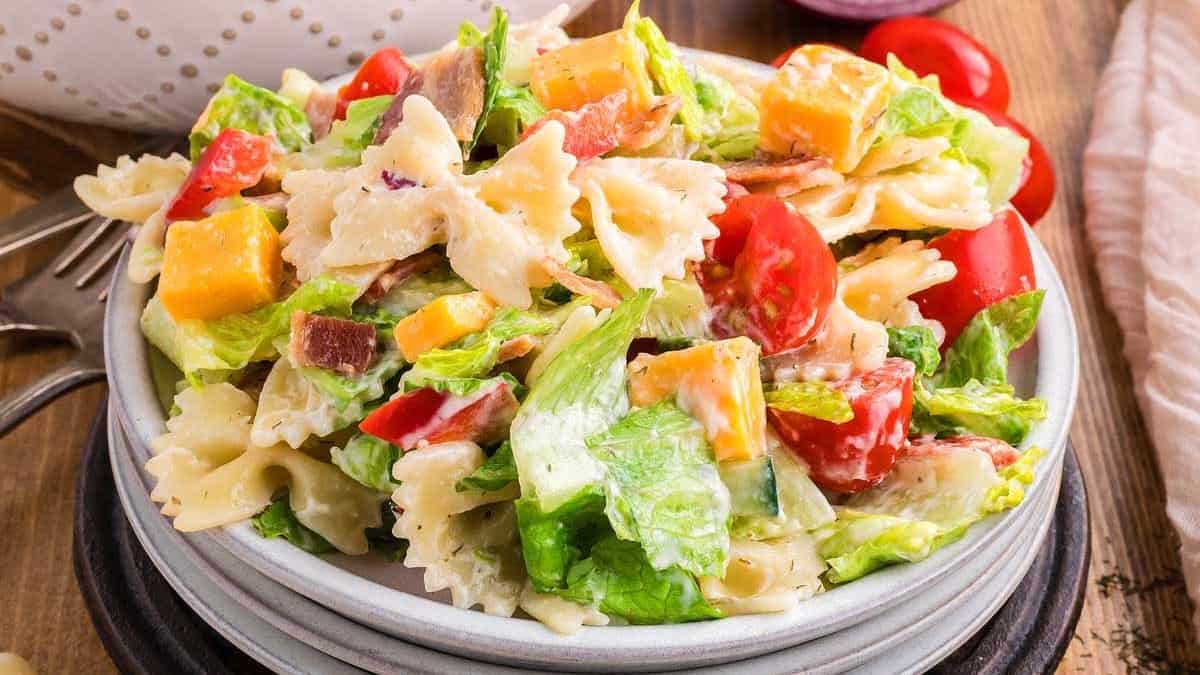 All the goodness of a classic BLT in pasta salad formโcrispy bacon, juicy tomatoes, and creamy dressing make it a crowd favorite.
