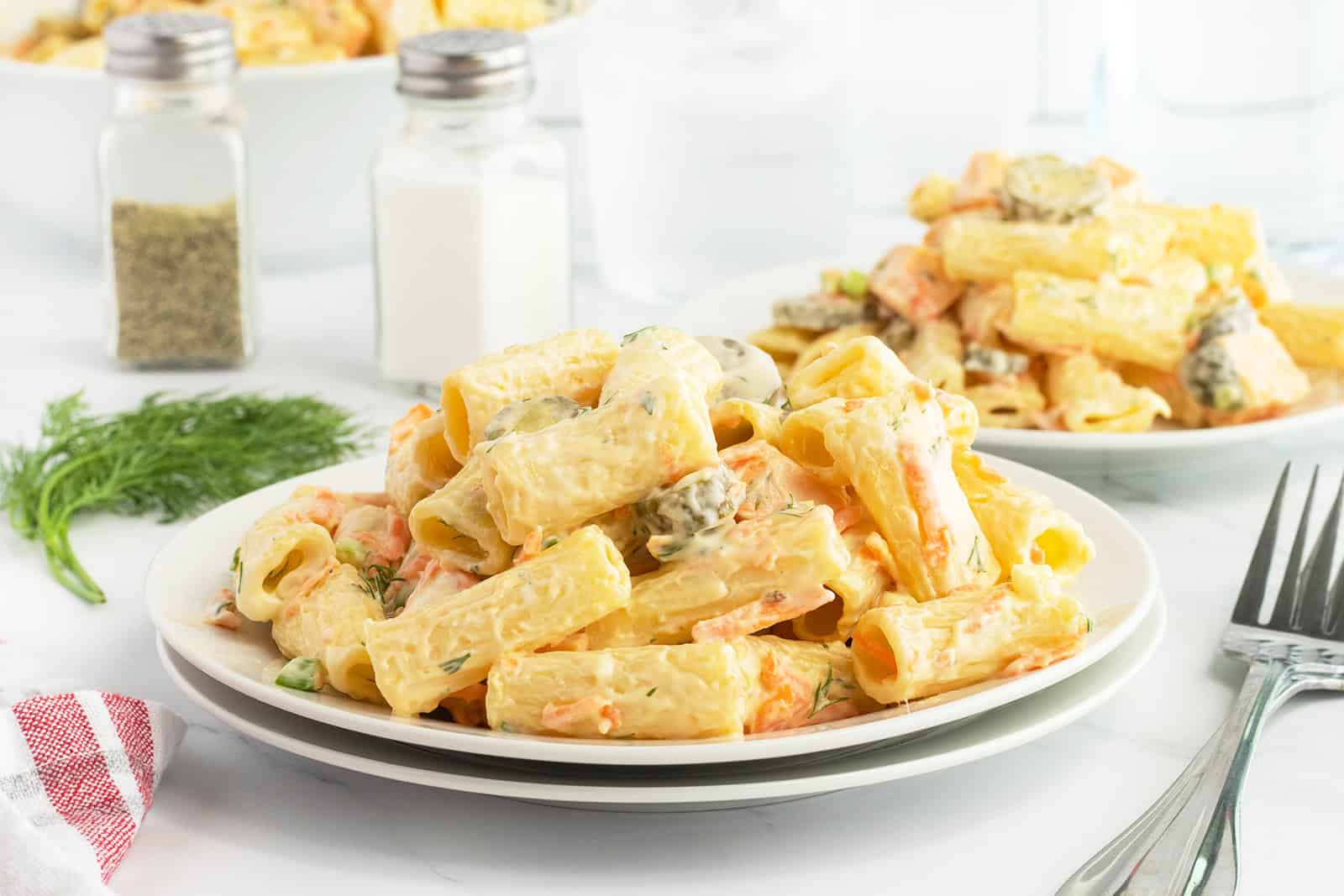 Tangy and creamy, this dill pickle pasta salad combines mayo, sour cream, and pickle juice for a punchy twist that pickle lovers will adore.