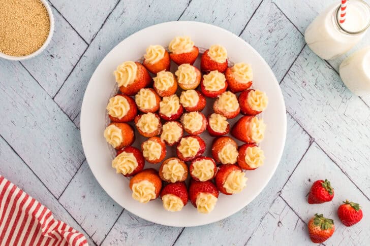 Juicy strawberries filled with creamy cheesecake and topped with graham cracker crumbs make for an elegant and easy treat.
