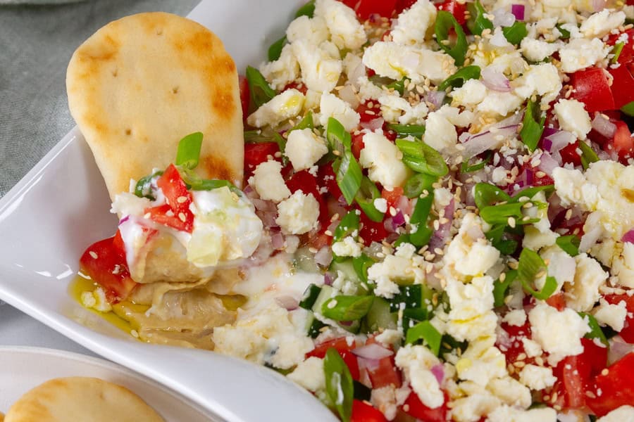 This layered dip features creamy hummus, Greek yogurt, crisp veggies, olives, and fresh herbs. A crowd-pleasing appetizer for any summer get-together.