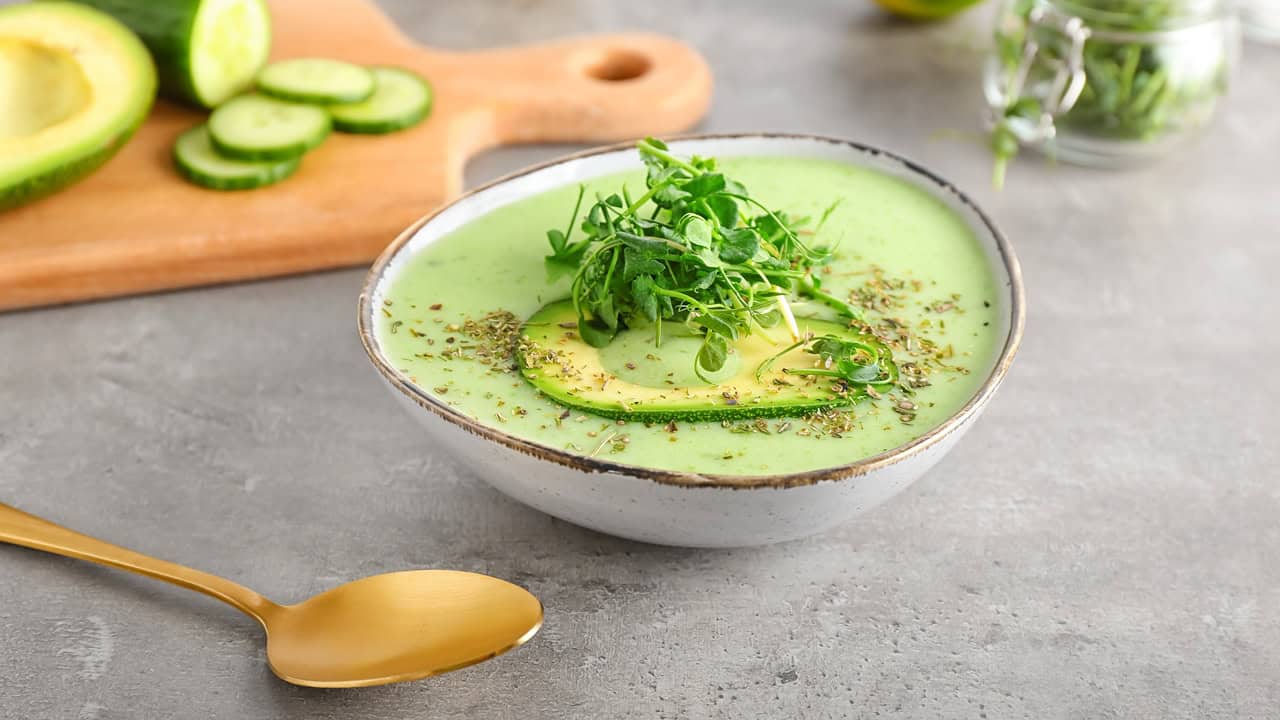 Chilled avocado soup is a refreshing twist on gazpacho. Blended with cucumber, yogurt, and herbs, itโs silky smooth and full of flavor.