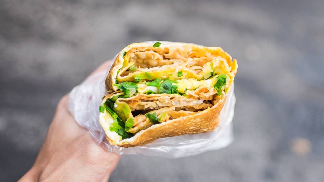 Jianbing is one of China’s most popular breakfast street foods. It’s a thin, savory crepe cooked on a large griddle, topped with egg, hoisin and chili sauce, cilantro, and crispy wonton or fried dough. Folded and served to-go, it’s crunchy, chewy, spicy, and sweet all at once. Often customized with sausage, chicken, or tofu, jianbing is both quick and deeply satisfying, perfect for fueling a morning walk through busy Chinese markets.