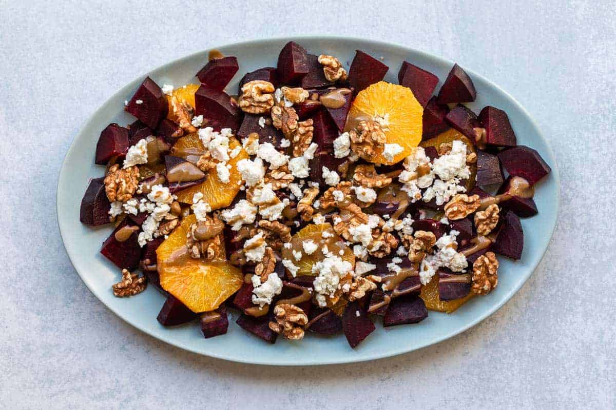 Roasted beets, citrusy orange slices, crunchy walnuts, and salty feta come together in this vibrant Beet Salad, finished with a balsamic vinaigrette.