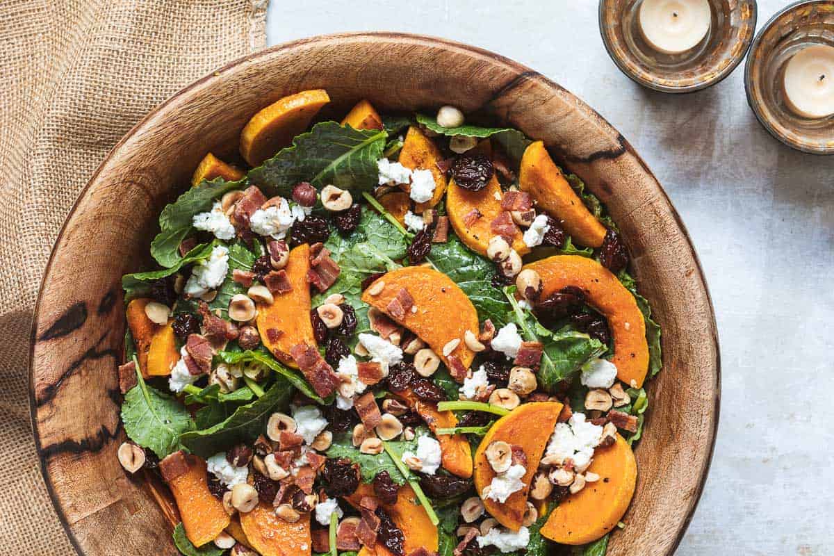 This Kale Butternut Squash Salad is packed with baby kale, roasted squash, toasted hazelnuts, dried cherries, and goat cheese, all tossed in a maple vinaigrette with crispy bacon.