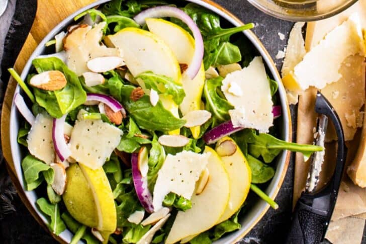 This Pear Gorgonzola Salad combines peppery arugula, bitter radicchio, sweet pears, creamy Gorgonzola, and crunchy glazed walnuts, all tossed in a tangy balsamic vinaigrette.