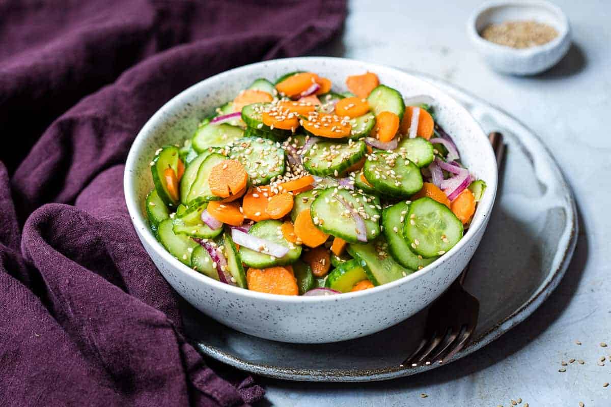 Cool and crunchy, this Cucumber Carrot Salad strikes the perfect balance of sweet and sour, making it a refreshing and simple side dish.
