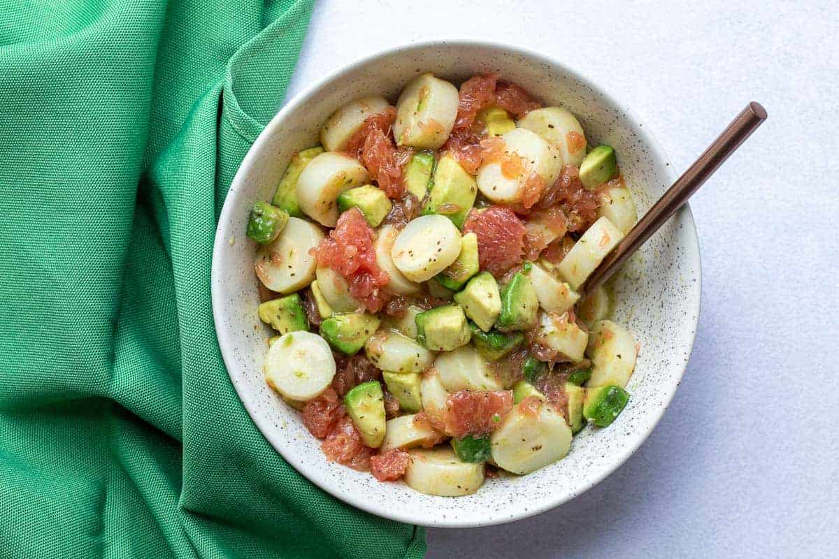 Hearts of Palm Salad is a light and refreshing dish featuring creamy avocado, tangy pink grapefruit, and tender hearts of palm for a unique and delicious combination.